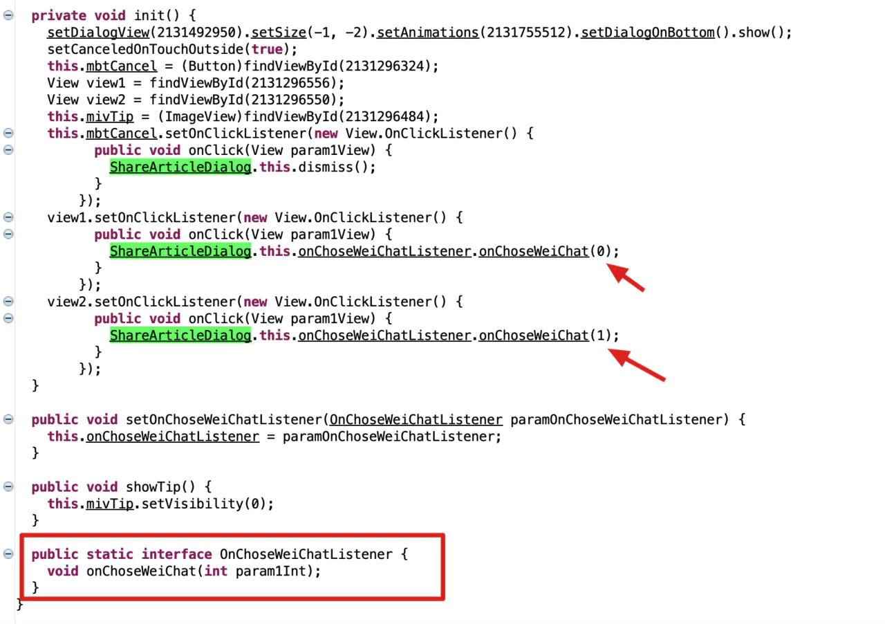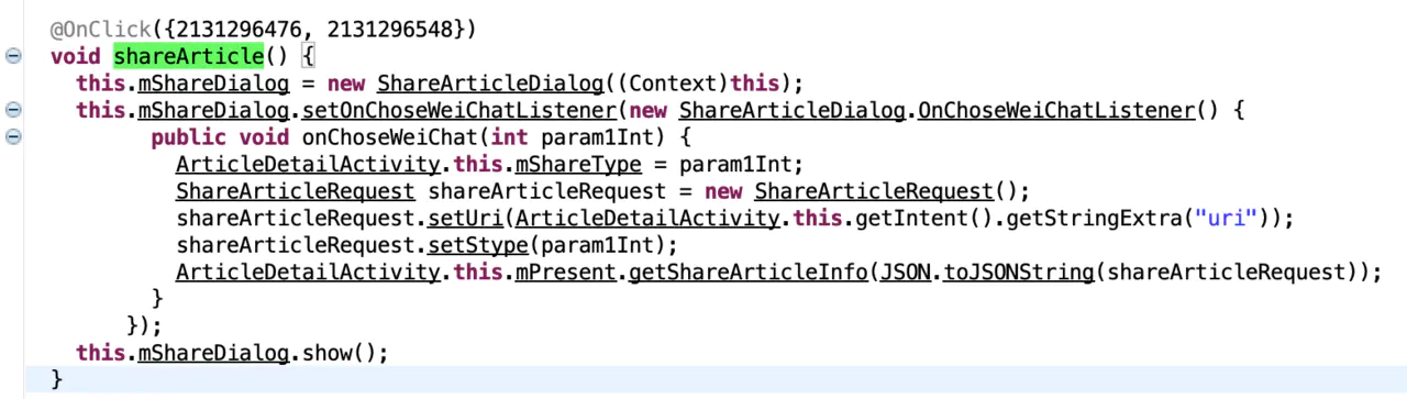 这个就很好理解了,自定义一个底部对话框,点击传递分享的 Url 以及分享类型。现在我们去 ShareArticleDialog 这个类中验证一下猜想是否正确?