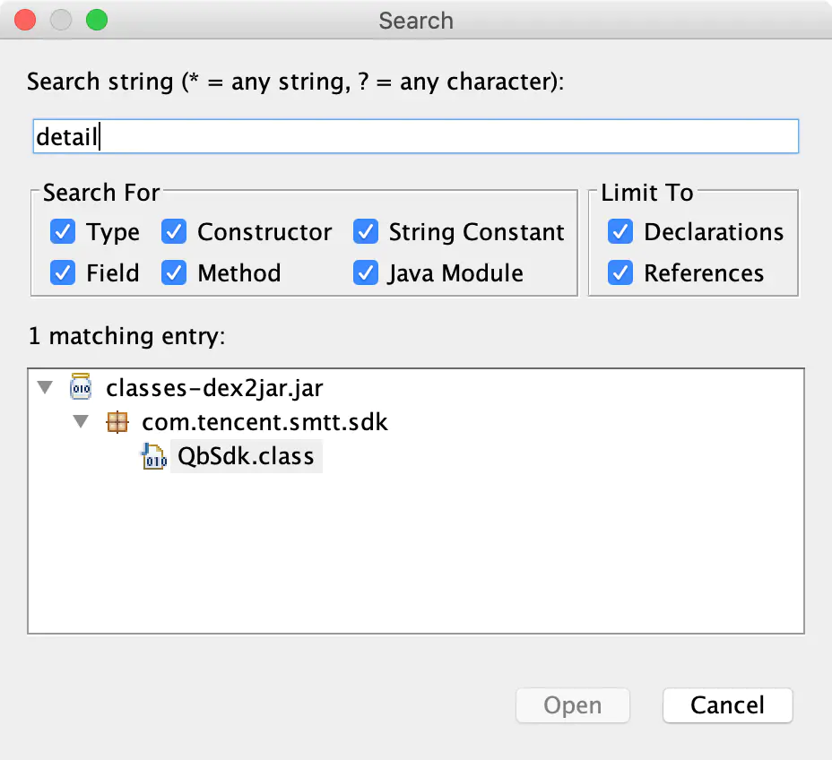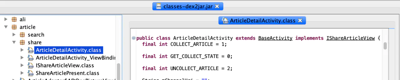 由于目标 App 是在文章的详情页中提供分享微信消息回话以及朋友圈,详情一般个人命名为 XxxDetailsActivity,根据这个思路去搜索。