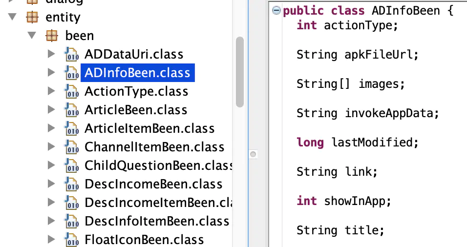 在这块发现个比较有意思的东西,可能是我比较 low 吧。一般而言,我们都知道混淆实体类是肯定不能被混淆的,不然就会出现找不到的情况。那么奇怪了,昨天逆向 B 站 Apk,我竟然没发现实体类,难道他们的实体类有其他神操作?还是说分包太多我没找到?